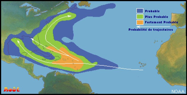 Il est à noter que l’Anticyclone subtropical se divise en deux cellules lors de l’été boréal. Les hautes pressions de l’Atlantique Nord se partagent entre l’Anticyclone des Açores et l’Anticyclone des Bermudes. Ces deux anticyclones produisent des zones de calme dans leur Sud-Ouest. « Ces zones de calme engendrent une zone de divergence dans la troposphère (de 0 à 17 km en altitude). La plupart des dépressions qui traversent cette zone névralgique y acquièrent un renforcement cyclonique souvent considérable. » (chapitre 12 météorologie tropicale Cours et manuel n°14 Météorologie générale et Maritime Ecole nationale de la Météorologie METEO France) Voici les cartes de trajectoires prévisionnelles émises par le National weather service et la NOAA, elles donnent de bons repères.